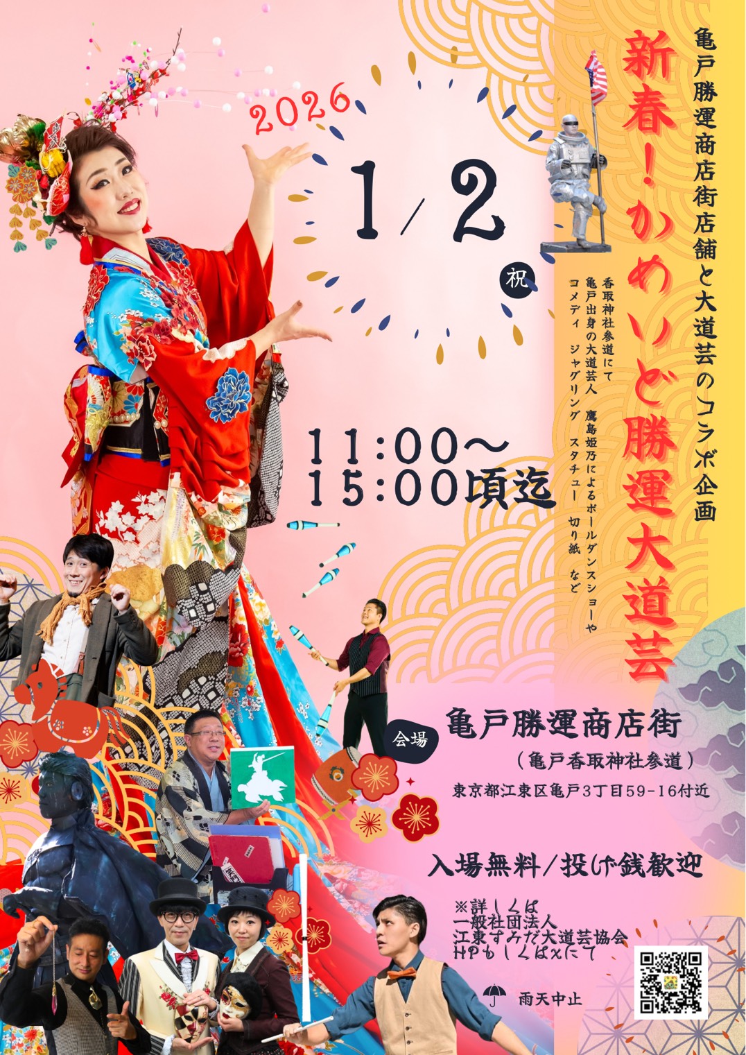 「新春!かめいど勝運大道芸」 日時 2026年1月2日 場所 亀戸勝運商店街(亀戸香取神社参道) 開催予定時間 11:00-15:00 入場無料/投げ銭歓迎/雨…